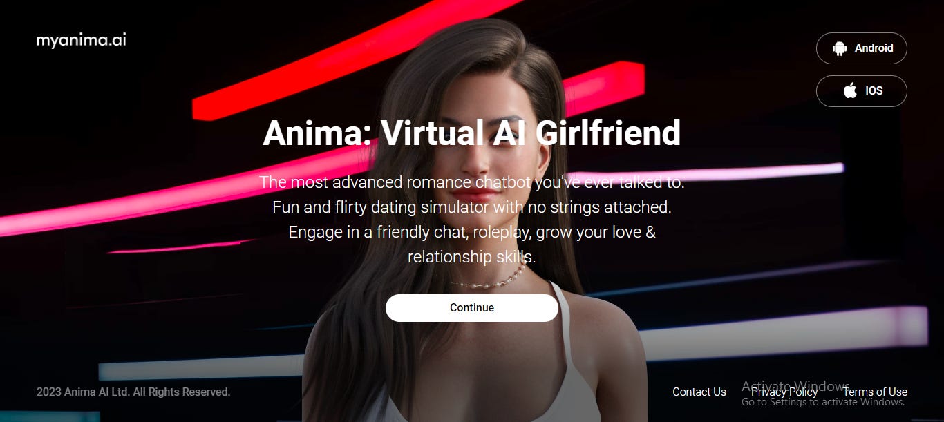 You can engage with Anima’s AI characters on various topics, including general, romantic, meaningful, or private conversations.