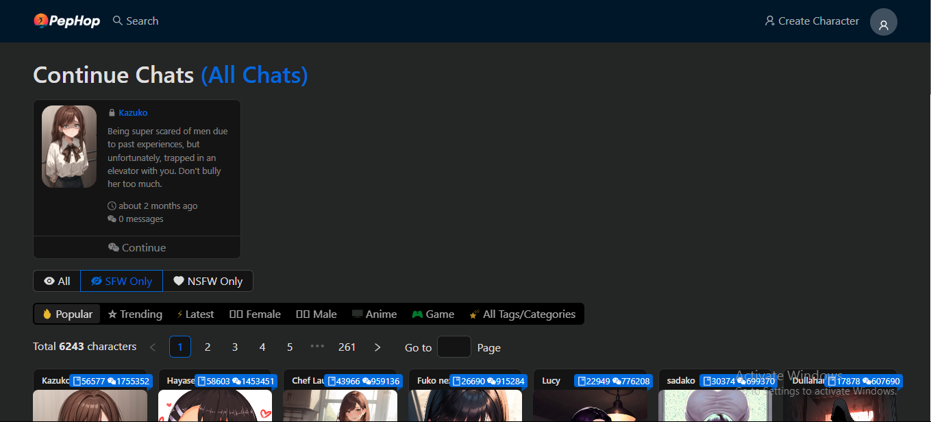 PepHOP AI is another AI-powered tool that gives you access to over 6000 AI characters with unique personalities and sexual likings. In order to start sex chatting with a PepHOP virtual character, all you need to do is find the one that suits your preferences using the search filters and get started. The best feature of PepHop AI is that it presents all AI characters in unique scenarios and settings, allowing you to start a conversation according to the introduced situation.