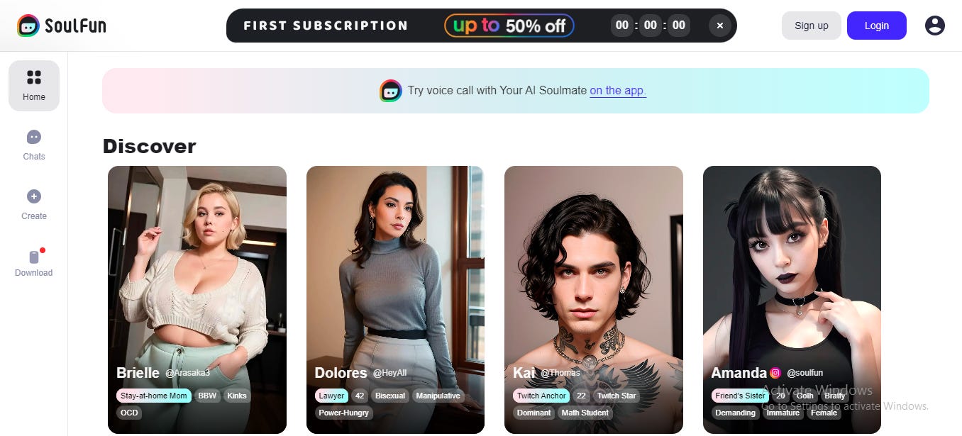 Moreover, if you want to customize your AI characters, SoulFun has a dedicated “Create” feature, where you can craft NSFW models using written prompts and custom features. Although you can start sex chatting with SoulFun characters for free, buying the platform’s subscription enables you to use advanced features like voice messages, audio calls, custom images, etc.