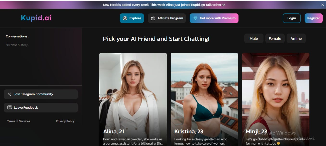 Kupid AI is another perfect place to sext with the hottest male, female, and anime characters. The AI romantic partners at Kupid AI are designed to engage in meaningful conversations and offer human-like experiences. The Kupid AI website has a user-friendly interface, allowing users to simply pick their preferred AI characters and start chatting with them.